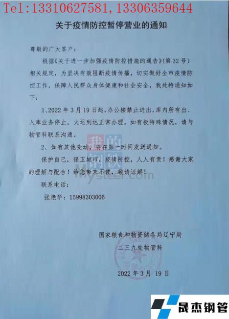 目前沈陽(yáng)厚壁無(wú)縫鋼管中心批發(fā)市場(chǎng)已發(fā)布通告,19日起北一西路東西樓試試封閉管控、嚴(yán)禁人員進(jìn)入辦公,出庫(kù)業(yè)務(wù)暫停、火車到達(dá)正常辦理;中國(guó)兵工物資125庫(kù)通告19日起嚴(yán)禁人員進(jìn)入庫(kù)區(qū)辦公,出庫(kù)業(yè)務(wù)暫停、火車到達(dá)正常辦理;國(guó)家糧食和物資儲(chǔ)備局遼寧局二三九處通告19日起辦公樓嚴(yán)禁進(jìn)出,庫(kù)內(nèi)所有出入庫(kù)業(yè)務(wù)暫停、火運(yùn)到達(dá)正常辦理。市內(nèi)其他主要厚壁無(wú)縫鋼管市場(chǎng)反饋暫時(shí)正常辦公及出庫(kù),但從防控指揮部通告內(nèi)容來(lái)看、也有暫停營(yíng)業(yè)的傾向。(通告見(jiàn)文末圖片)