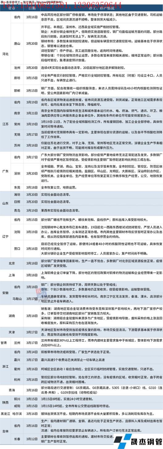 截至3月21日,匯總了16個(gè)省份停工停產(chǎn)最新信息。其中,3月21日,南京全市范圍內(nèi)除保障市民生活和城市基本運(yùn)行的水、電、燃油、燃?xì)狻⑼ㄓ?、環(huán)衛(wèi)、糧油肉菜供應(yīng)等公共服務(wù)類企事業(yè)單位外,其他有條件的單位盡可能安排居家辦公。3 月20日,唐山開平區(qū)、豐南區(qū)、灤州市、遷西縣全域?qū)嵤﹪?yán)格封控管理;大部分鋼企維持生產(chǎn),但政府實(shí)施道路管控,無縫厚壁鋼管廠家均面臨運(yùn)輸方面的問題。深圳全市福田、羅湖、南山、寶安、龍崗以及龍華暫未恢復(fù),全市封控區(qū)、管控區(qū)、防范區(qū)繼續(xù)嚴(yán)格執(zhí)行疫情防控相關(guān)措施。山東濰坊日照、青島萊西市實(shí)現(xiàn)社會(huì)面動(dòng)態(tài)清零。河北滄州連續(xù)4天實(shí)現(xiàn)社會(huì)面動(dòng)態(tài)清零,3月20日起部分地區(qū)逐步解除封控。具體情況如下: