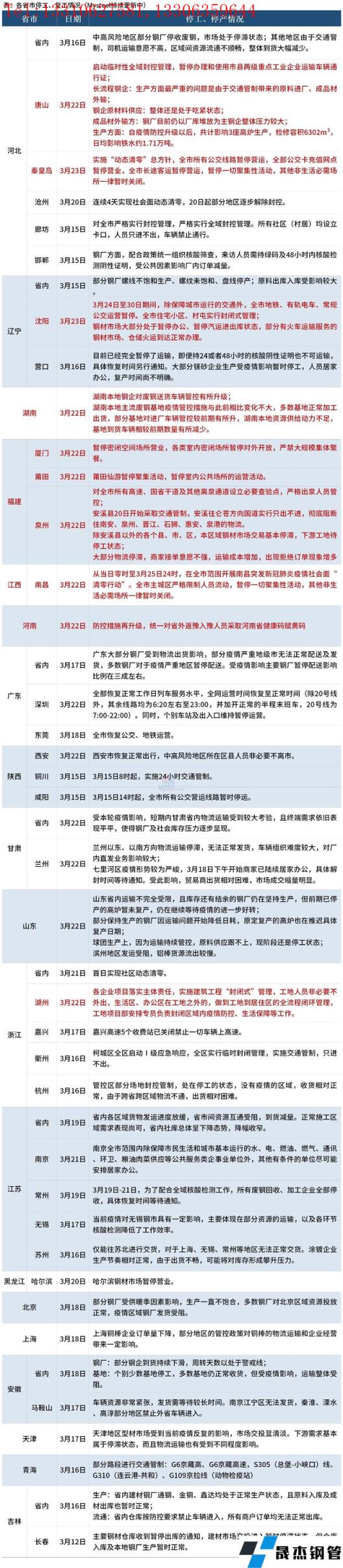 其中,3月22日,唐山市啟動(dòng)臨時(shí)性全域封控管理,暫停辦理和使用市縣兩級(jí)重點(diǎn)工業(yè)企業(yè)運(yùn)輸車輛通行證。沈陽(yáng)于3月24日至30日期間,除保障城市運(yùn)行的交通外,全市地鐵、有軌電車、常規(guī)公交運(yùn)營(yíng)暫停,全市住宅小區(qū)、村屯實(shí)行封閉式管理;厚壁無(wú)縫鋼管市場(chǎng)大部分處于暫停辦公、暫停汽運(yùn)進(jìn)出庫(kù)狀態(tài),部分有火車運(yùn)輸服務(wù)的厚壁無(wú)縫鋼管市場(chǎng)、倉(cāng)儲(chǔ)火運(yùn)到達(dá)正常辦理。3月20日福建泉州安溪縣開(kāi)始采取交通管制,除安溪縣以外的各個(gè)縣、市、區(qū),本區(qū)域厚壁無(wú)縫鋼管市場(chǎng)交易基本停滯,下游工地待停工狀態(tài)。具體情況如下: