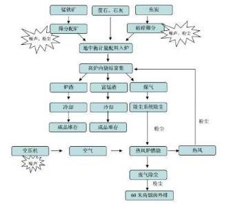富錳渣生產(chǎn)線整個工藝系統(tǒng)由原材料入廠、儲存、電子稱稱量、皮帶輸送機(jī)上料、布料小車布料、高爐還原冶煉、鐵水包,成品入庫及成品發(fā)放等組成。在生產(chǎn)過程中排出大量的高溫含塵煙氣,煙氣主要成份是煤氣,所產(chǎn)生的煙塵是要是爐塵和瓦斯泥。