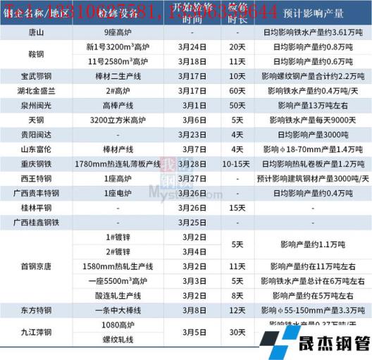 據(jù)不完全統(tǒng)計(jì),截至3月28日超20家無縫厚壁鋼管廠家發(fā)布檢修計(jì)劃。其中,檢修時(shí)間最長的是湖北金盛蘭,計(jì)劃自3月17日對(duì)2#高爐進(jìn)行檢修兩個(gè)月,預(yù)計(jì)影響鐵水產(chǎn)量約0.4萬噸/天,復(fù)產(chǎn)時(shí)間5月16日。