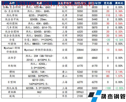 核心觀點:上周厚壁無縫鋼管市場整體小幅上漲,五一假期前后,市場存在小幅度的需求放量,疊加節(jié)前現(xiàn)貨成本普遍偏高,因此現(xiàn)貨價格多數(shù)在節(jié)后小幅上漲;另一方面,市場對于疫情緩解后的需求釋放情況保持樂觀,因此從預期方面而言也多以看漲較多;在有色方面,整體下游行業(yè)消費不及預期,銅、鋁上周價格有所下滑,市場整體呈現(xiàn)較為弱勢。