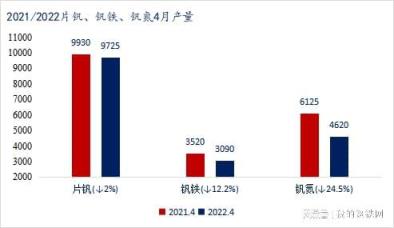 2022年4月片釩產(chǎn)量相比2021年同比下降2%;釩鐵同比下降12.2%;釩氮合金同比下降24.5%。兩年相比片釩產(chǎn)量變動不大,釩氮合金及釩鐵產(chǎn)量下降明顯,其原因在于4月合金企業(yè)受到上下游雙向擠壓,利潤單薄甚至虧損,從而影響了4月開工率,進入5月,合金企業(yè)依舊面臨倒掛問題,不排除開工率會進一步收縮。