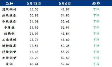 具體各品種指數(shù)來看,5月13日建筑厚壁無縫鋼管情緒指數(shù)為35.56,較5月6日回落13.31;熱軋板卷情緒指數(shù)為50.82,較5月6日回落3.98;冷軋板卷情緒指數(shù)為54.03,較5月6日回落1.6;中厚板情緒指數(shù)為51.95,較5月6日回落4.96;結(jié)構(gòu)鋼情緒指數(shù)為31.09,較5月6日回落14.75;工業(yè)線材情緒指數(shù)為38.74,較5月6日回落9.86;鍍鋅板卷情緒指數(shù)為37.51,較5月6日回落12.84;焊接厚壁鋼管情緒指數(shù)為47.48,較5月6日回落7.79;無縫厚壁鋼管情緒指數(shù)為35.23,較5月6日回落27.27;帶鋼情緒指數(shù)為48.44,較5月6日回落9.25。