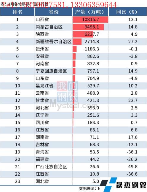 從分省數(shù)據(jù)來看,1-4月山西、內(nèi)蒙古、陜西、新疆、貴州5省原煤產(chǎn)量合計為121281.8萬噸,占全國總產(chǎn)量的83.8%。其中,山西、內(nèi)蒙古、陜西、新疆、貴州原煤產(chǎn)量累計同比分別增長9.9%、14.6%、5.8%、29.0%和3.0%。