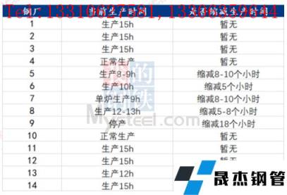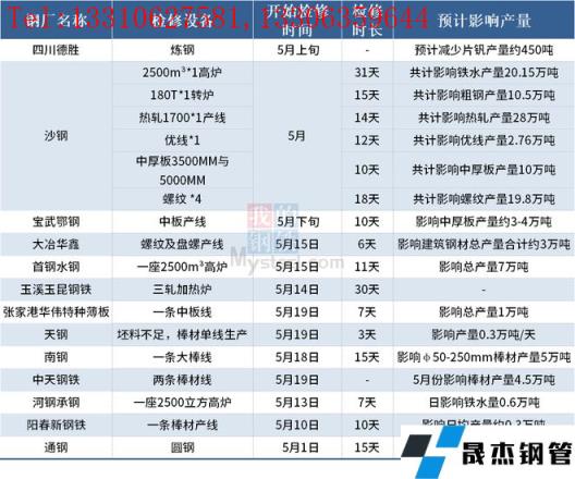 據(jù)不完全統(tǒng)計,截至5月20日,國內(nèi)13家無縫厚壁鋼管廠家發(fā)布檢修計劃。其中,中天鋼鐵因一座轉(zhuǎn)爐檢修,坯料不足,兩條棒材線停產(chǎn)檢修,預(yù)計5月份影響棒材產(chǎn)量4.5萬噸。