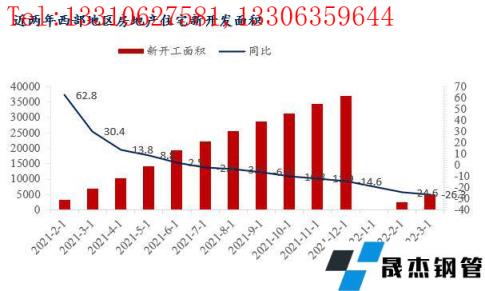 2022年以來,從上圖可以看出來,受住房不炒政策受影響,西北區(qū)域各省市房地產(chǎn)開發(fā)進度緩慢,房地產(chǎn)開發(fā)企業(yè)投資完成額以及新開工面積同比均是小幅下降。分省市來看,陜西作為西北經(jīng)濟龍頭老大,房地產(chǎn)開發(fā)投資表現(xiàn)較好。2022年一季度,陜西省房地產(chǎn)開發(fā)企業(yè)完成投資674.03億元,同比增長5%,比1-2月提高1.8個百分點。而甘肅區(qū)域,一季度GDP同比增長5.3%,固定資產(chǎn)投資同比增長12.9%。其中,項目投資增長13.4%,房地產(chǎn)開發(fā)投資增長11.7%,商品房銷售面積下降10.7%。另外如分別是寧夏區(qū)域房地產(chǎn)開發(fā)投資增長增速為-1%。這在去年寧夏區(qū)域房地產(chǎn)開發(fā)投資增速為正數(shù),今年面臨較大下行壓力。整體來說,由于受疫情以及資金問題,工程項目進度不如預(yù)期,厚壁無縫鋼管需求量同比減少,這也是前期西北區(qū)域建筑厚壁無縫鋼管消化緩慢以及庫存積壓原因。