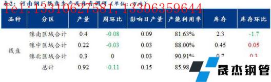 1、調研數(shù)據(jù)顯示,統(tǒng)計的河南地區(qū)10家建筑厚壁無縫鋼管樣本無縫厚壁鋼管廠家中,河南省無縫厚壁鋼管廠家線盤日均產(chǎn)量0.92萬噸,較上周產(chǎn)量減少0.11萬噸;線盤產(chǎn)能利用率85.98%,較上周減少10.28%。