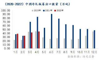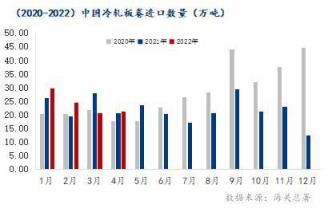 海關總署數(shù)據顯示:2022年1-4月份我國冷軋板(帶)出口總量共計159.53萬噸,年同比下降40.79%。2022年1-4月份我國冷軋板(帶)進口總量共計96.25萬噸,年同比上升1.90%。