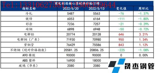截止2022年5月20日,各原材料當(dāng)日即時價格以及價格周環(huán)比情況如下: