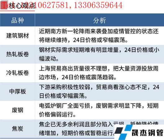 建筑厚壁無縫鋼管:5月23日,全國31個(gè)主要城市20mm三級(jí)抗震螺紋鋼均價(jià)4839元/噸,較上個(gè)交易日下跌10元/噸。短期來看,目前市場供應(yīng)端同比持續(xù)低位,同時(shí)近期南方新一輪降雨來襲疊加疫情管控的狀態(tài)還將繼續(xù)維持,消費(fèi)難有好轉(zhuǎn)預(yù)期。目前市場仍然處于供需雙弱的格局。短期市場關(guān)注點(diǎn)仍在于消費(fèi)能否有效恢復(fù)以及雨季對(duì)于消費(fèi)的影響,因此預(yù)計(jì)24日國內(nèi)建筑厚壁無縫鋼管現(xiàn)貨價(jià)格窄幅震蕩為主。