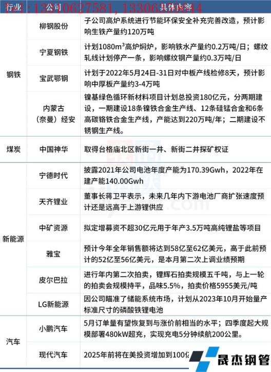 5月24日,匯總部分大宗商品相關(guān)企業(yè)動態(tài)。寧夏鋼鐵、寶武鄂鋼宣布檢修計劃,柳鋼股份計劃進(jìn)行高爐改造;天齊鋰業(yè)董事長蔣衛(wèi)平表示,鋰電行業(yè)景氣度高,未來幾年內(nèi)下游電池廠商擴(kuò)張速度預(yù)計還是遠(yuǎn)高于上游鋰供應(yīng)。具體情況如下: