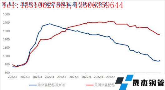 雖然4月上旬全球成品鋼價格延續(xù)上漲,致使北美、歐洲、土耳其等主要產(chǎn)鋼國日均產(chǎn)量小幅上漲(3-5%),但4月下旬成品鋼跌幅明顯大于原材料尤其是鐵礦石下跌幅度。表5為近三月美國和歐洲熱卷價格與鐵礦石價差,該價差僅取主流價格且未經(jīng)嚴(yán)格計算不代表生產(chǎn)成本,僅作利潤變化的趨勢參考??梢姎W洲熱軋板卷與鐵礦石價差在3月中下旬達(dá)到高點后,在整個4、5月份連續(xù)下降,相比之下該價差在美國的降幅相對較小。