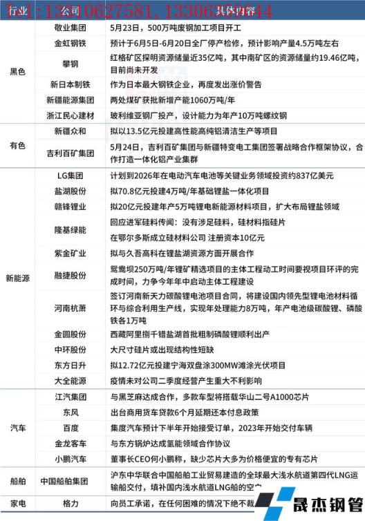 金虹鋼鐵預(yù)計(jì)于6月5日-6月20日全廠停產(chǎn)檢修,預(yù)計(jì)影響產(chǎn)量4.5萬噸左右;新疆眾和擬以13.5億元投建高性能高純鋁清潔生產(chǎn)等項(xiàng)目;LG集團(tuán)計(jì)劃到2026年在電動汽車電池等關(guān)鍵業(yè)務(wù)領(lǐng)域投資約837億美元;格力向員工承諾,在任何困難的情況下絕不裁員。具體情況如下: