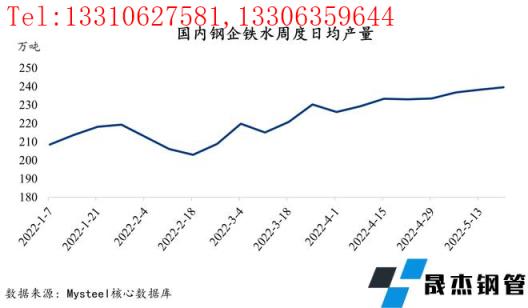 截止到5月20日, 247家鋼鐵企業(yè)樣本日均鐵水產(chǎn)量由4月初的226.1萬噸上漲13萬噸,漲幅約為5.7%。