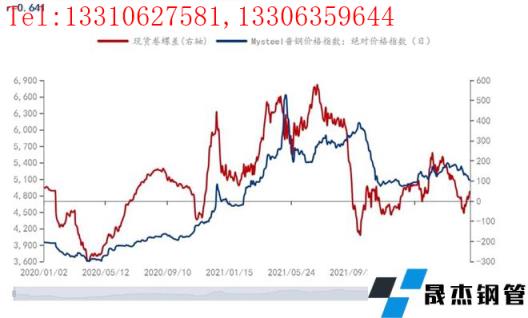 從上述五個階段,盤面卷螺差在鋼價上行中更容易走高,在鋼價下跌中更容易走低(第一階段、第二階段),但也會出現(xiàn)一定的分化。在第三階段,為貫徹實施碳達(dá)峰、碳中和,無縫厚壁鋼管廠家供應(yīng)減少、供需錯配,此時建筑厚壁無縫鋼管供應(yīng)大幅收縮,雖然鋼價暴漲,但盤面卷螺差高位震蕩。經(jīng)濟(jì)周期上行時,制造業(yè)需求向好,卷板漲勢更好;反之在經(jīng)濟(jì)下行周期,制造業(yè)需求萎縮,卷板更多是跟隨建筑厚壁無縫鋼管趨勢波動。第四階段、第五階段,鋼價暴跌后筑底反彈,盤面卷螺差則繼續(xù)震蕩走勢,但高點降低,反映了在經(jīng)濟(jì)下行周期,制造業(yè)表現(xiàn)低迷,為穩(wěn)增長建筑業(yè)表現(xiàn)會相對好些。