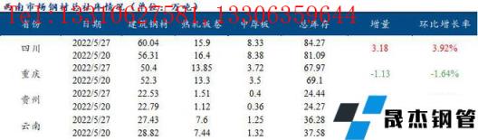 據(jù)調(diào)研,截止2022年5月27日,西南市場(chǎng)厚壁無(wú)縫鋼管累計(jì)社會(huì)庫(kù)存為212.96萬(wàn)噸,環(huán)比增加0.92萬(wàn)噸,漲幅0.43%。分省份來(lái)看,本周四川市場(chǎng)厚壁無(wú)縫鋼管庫(kù)存為84.27萬(wàn)噸,環(huán)比增加3.18萬(wàn)噸,漲幅3.92%;重慶市場(chǎng)厚壁無(wú)縫鋼管庫(kù)存為67.97萬(wàn)噸,環(huán)比減少1.13萬(wàn)噸,降幅1.64%;貴州市場(chǎng)厚壁無(wú)縫鋼管庫(kù)存為24.44萬(wàn)噸,環(huán)比增加0.17萬(wàn)噸,漲幅0.70%;云南市場(chǎng)厚壁無(wú)縫鋼管庫(kù)存為36.28萬(wàn)噸,環(huán)比減少1.3萬(wàn)噸,降幅3.46%。