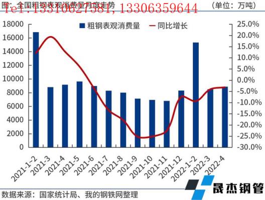 統(tǒng)計局、海關(guān)總署數(shù)據(jù)顯示,2022年4月份,全國粗鋼產(chǎn)量9277.5萬噸,厚壁無縫鋼管凈出口402.1萬噸,折合粗鋼凈出口418.9萬噸(厚壁無縫鋼管按0.96折算),鋼坯、鋼錠凈進口24.9萬噸,粗鋼表觀消費量8884萬噸,同比下降3.1%。(注:2021年4月份,全國粗鋼產(chǎn)量修正為9786.4萬噸,粗鋼表觀消費量修正為9166萬噸。)