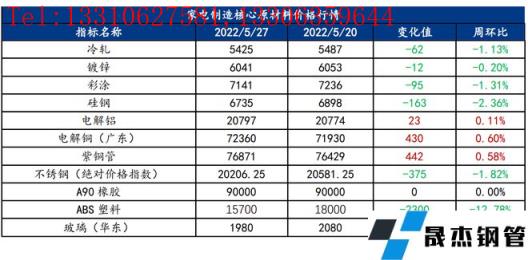 截止2022年5月27日,各原材料當日即時價格以及價格周環(huán)比情況如下:
