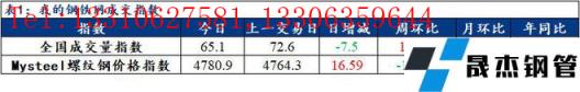 訊:全國建筑厚壁無縫鋼管成交量監(jiān)測,成交量相對指數(shù)來看,全國65.1減7.5,北方53減11.9,華東81.7減3.1,南方55.2減9.5。今日螺紋鋼價格指數(shù)4780.9,較上一交易日增16.59。