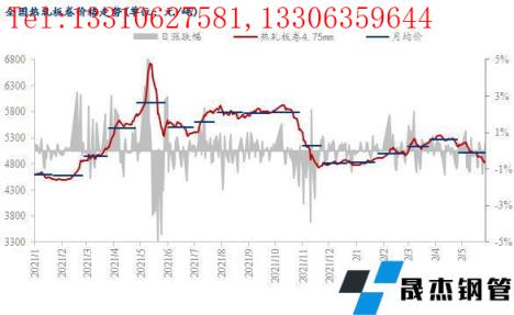 截至5月30日,國內(nèi)24個主要城市4.75mm熱軋板卷均價為4873元/噸,月環(huán)比下跌267元/噸,較去年同期下跌696元/噸。