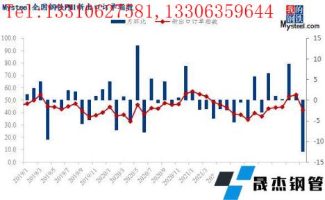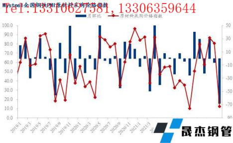 從相關(guān)指數(shù)來看,本月成品材出廠價指數(shù)大幅回落60.4個百分點至8.3,刷新年內(nèi)低點,無縫厚壁鋼管廠家成品材庫存指數(shù)回落9.5個百分點至63.4,仍處榮枯線上方。同時成材價格下跌倒逼原料價格,本月原材料采購價指數(shù)大幅回落68.5個百分點至12.1,國內(nèi)原材料采購量指數(shù)回落6.6個百分點至45.3,國外原材料采購量指數(shù)回落5.6個百分點至38.5。