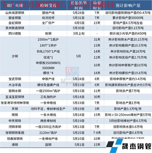據(jù)不完全統(tǒng)計,5月國內(nèi)18家無縫厚壁鋼管廠家發(fā)布檢修計劃。其中,磐金厚壁鋼管各分廠計劃將于5月31日至6月6日進行輪流檢修,預計將累計影響產(chǎn)量50000噸。