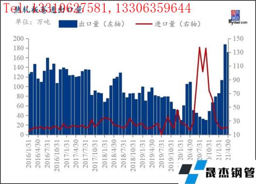 就目前來看,近期熱卷出口量暴增主要是因?yàn)?至4月份大批量出口單簽訂,并開始陸續(xù)發(fā)貨,因此4-6月份出口量或?qū)⒗^續(xù)攀升,但從近期出口市場訂單簽訂情況來看,我國熱軋板卷出口或?qū)⒃?月份開始減量。