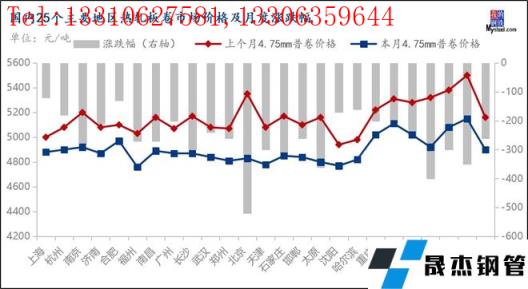 圖6:國內(nèi)25個(gè)主要地區(qū)熱軋板卷市場價(jià)格及月度漲跌幅
