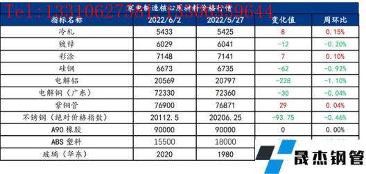 截止2022年6月2日,各原材料當(dāng)日即時(shí)價(jià)格以及價(jià)格周環(huán)比情況如下: