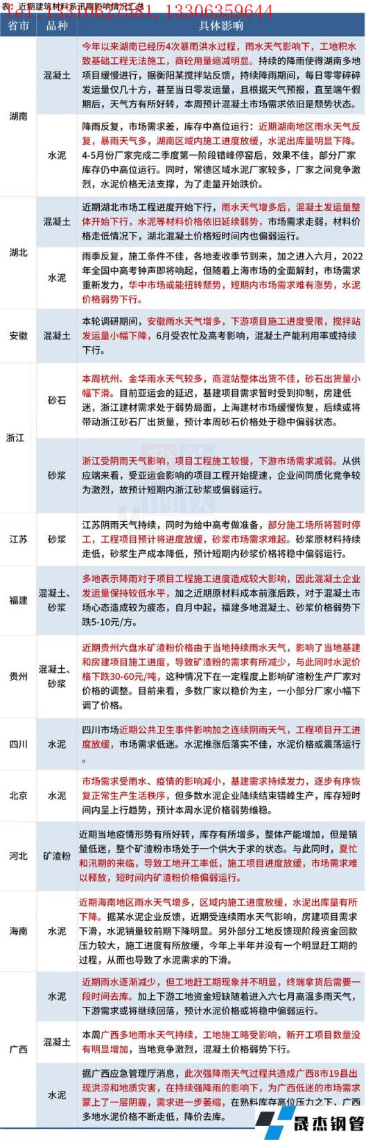 截至6月6日,據(jù)百年建筑網(wǎng)調(diào)研,華中、華東、西南、華南等12省市建材市場(chǎng)和建筑工地進(jìn)度受到明顯影響。短期來(lái)看隨著部分省份農(nóng)忙和大規(guī)模雨水天氣預(yù)報(bào)來(lái)臨,部分材料整體增量仍然有限,下游市場(chǎng)需求受到一定抑制,市場(chǎng)進(jìn)入需求淡季,端午節(jié)前后價(jià)格隨之出現(xiàn)下跌情況。具體情況如下: