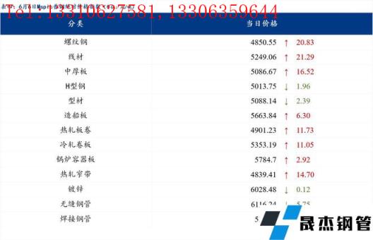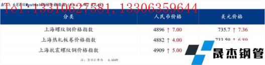 6月6日普鋼絕對(duì)價(jià)格指數(shù)變化:綜合指數(shù)5080.66,上漲14.13;螺紋鋼指數(shù)4850.55,上漲20.83;線材指數(shù)5249.06,上漲21.29;熱軋板卷指數(shù)4901.23,上漲11.73;冷軋板卷指數(shù)5353.19,上漲11.05;中厚板指數(shù)5086.67,上漲16.52。