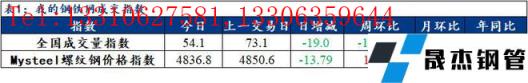 訊:全國建筑厚壁無縫鋼管成交量監(jiān)測,成交量相對指數來看,全國54.1減19,北方41減14.5,華東68.9減20.6,南方46.4減20。今日螺紋鋼價格指數4836.8,較上一交易日減13.79。