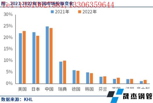 分國別來看,2022年全球各國市場份額排名前三的國家分別是中國、美國、日本,2022年這三個國家市場份額分別為24.2%、22.9%、20.8%,三個國家在全球市場份額已經(jīng)達(dá)到了67.9%。其中,中國和日本2022年市場份額分別下降0.7個百分點(diǎn)、1.6個百分點(diǎn),美國2022年市場份額提高1個百分點(diǎn)。