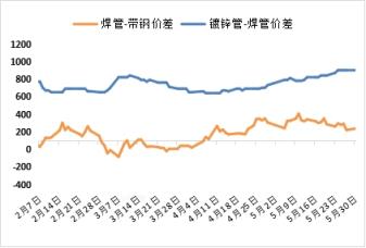 5月焊管較帶鋼價差由高位逐步收窄,結算周期內焊管廠平均利潤13元,架子管月內平均虧損51元;鍍鋅管較焊管價差有所走擴。5月焊鍍管廠綜合生產利潤得以改善。