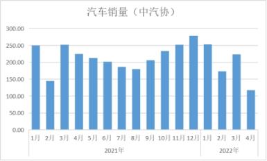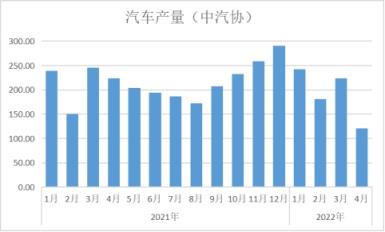 根據(jù)中國汽車工業(yè)協(xié)會統(tǒng)計(jì)數(shù)據(jù)顯示,2022年4月份,汽車產(chǎn)銷分別完成120.5萬輛和118.1萬輛,環(huán)比分別下降46.2%和47.1%,同比分別下降46.1%和47.6%。1-4月,汽車產(chǎn)銷分別完成769.0萬輛和769.1萬輛,同比分別下降10.5%和12.1%。