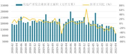 1-4月份,房屋新開工面積39739萬(wàn)平方米,同比下降26.3%;從單月來看,自去年4月份開始,新開工面積持續(xù)負(fù)增長(zhǎng),今年4月份同比降幅由上月的22.2%擴(kuò)大至44.2%,新開工下行明顯加快,對(duì)后期施工和行業(yè)的投資形成制約。