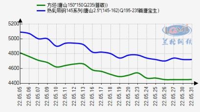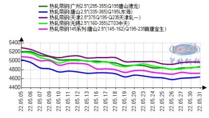 五月份國內(nèi)帶鋼市場基本呈現(xiàn)震蕩弱行態(tài)勢。帶鋼市場在月初受公共衛(wèi)生事件影響,鋼企復(fù)工復(fù)產(chǎn)積極性低迷,貿(mào)易商心態(tài)以謹(jǐn)慎觀望為主。市場隨著下游需求恢復(fù)緩慢,市場活躍度較低,成交量平平。但中旬隨著相關(guān)政策的出臺,物流運(yùn)輸方面仍受限,加之焦炭第二輪提降落地,市場看空情緒加重。下旬伴隨各地疫情反復(fù),市場停滯狀態(tài)仍存。商貿(mào)迫于成本壓力挺價意愿濃厚,然需求寥寥,無奈小幅降價促進(jìn)成交。截止至5月31日,華北地區(qū)唐山小窄帶報價主流為4720元/噸,唐山355系窄帶鋼主流報價為4640元/噸,天津355系窄帶主流報價為4970元/噸,華東地區(qū)無錫355系窄帶主流報價為4850元/噸,華南地區(qū)廣州355系窄帶主流報價為4870元/噸。