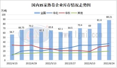 截止2022年6月24日,據(jù)云商平臺(tái)監(jiān)測數(shù)據(jù)顯示,國內(nèi)熱軋卷板社會(huì)庫存量約為264.53萬噸,環(huán)比增加20.82萬噸。重點(diǎn)城市庫存整體表現(xiàn)不一,華東區(qū)域受上海復(fù)工復(fù)產(chǎn)影響小幅消庫為主,華北、華南庫存持續(xù)累庫。具體來看,廣州地區(qū)熱卷社會(huì)庫存量約為71.00萬噸,環(huán)比增加9.09萬噸;上海熱卷社會(huì)庫存量環(huán)比下降4.84萬噸至37.00萬噸;天津熱卷社會(huì)庫存量約為8.00萬噸,環(huán)比增加0.80萬噸。