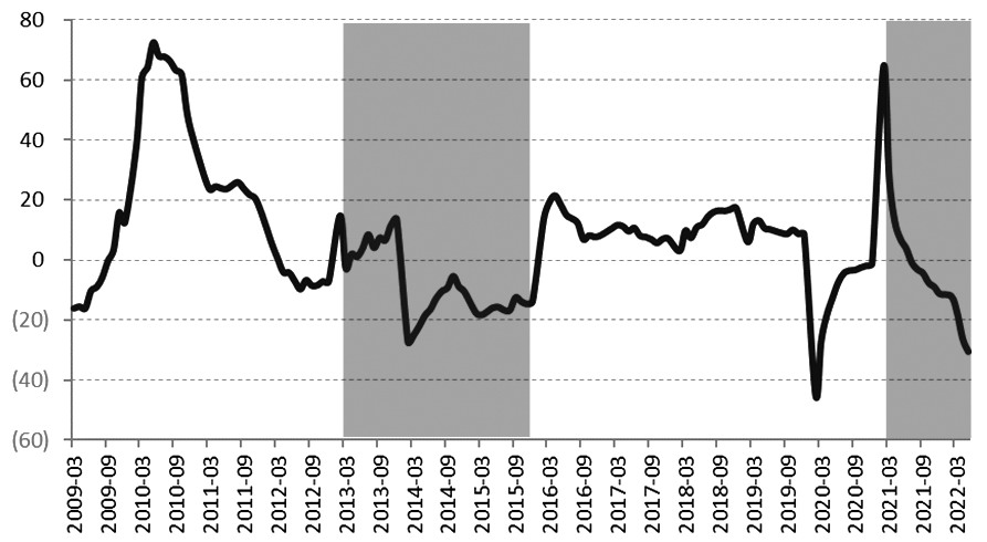 本輪地產(chǎn)調(diào)整周期始于2021年第二季度。在地產(chǎn)相關(guān)政策的驅(qū)動(dòng)下,從2021年第四季度開(kāi)始,地產(chǎn)新開(kāi)工面積再次進(jìn)入負(fù)增長(zhǎng)狀態(tài),疊加疫情影響,降幅呈現(xiàn)加速下滑態(tài)勢(shì)。受此影響,螺紋鋼需求降幅可見(jiàn)一斑。根據(jù)上述分析,我們可以清晰看到,當(dāng)前螺紋鋼的需求表現(xiàn)和2013年有很大相似之處。