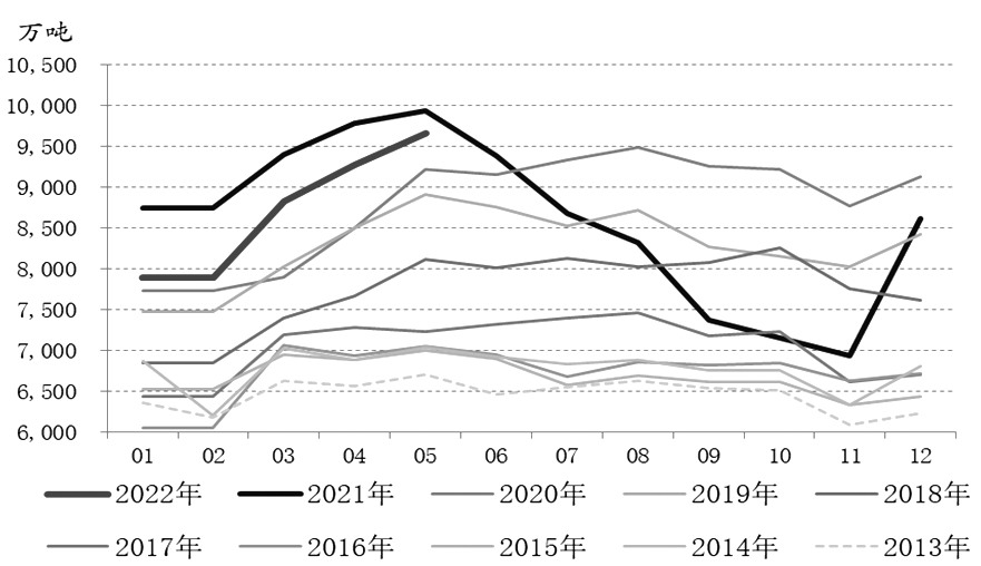 在過(guò)去近20年的時(shí)間中,我國(guó)粗鋼產(chǎn)量呈現(xiàn)逐年上升趨勢(shì)。2013年,我國(guó)粗鋼月均產(chǎn)量為6454.8萬(wàn)噸。而今年1—5月,我國(guó)粗鋼月均產(chǎn)量達(dá)到8712.7萬(wàn)噸。