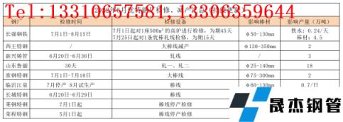 上半年無(wú)縫鋼管廠家出廠價(jià)格以下調(diào)為主要基調(diào),優(yōu)特鋼尤其普優(yōu)品種6月中下旬出現(xiàn)虧損,且在需求萎縮、庫(kù)存壓力、前景迷茫、無(wú)重大政策支撐的情況下,個(gè)別無(wú)縫鋼管廠家開(kāi)始增加停產(chǎn)、減產(chǎn)計(jì)劃,預(yù)計(jì)7月份優(yōu)特鋼產(chǎn)量有所下降,具體檢修情況如下: