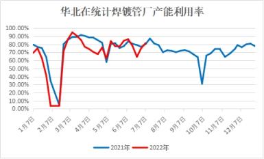 焊鍍管廠產(chǎn)能走勢與往年趨同,但更具靈活性。1月中旬左右冬奧會(huì)管控供應(yīng)端消息發(fā)散,停產(chǎn)停工晚于往年,南方部分管廠產(chǎn)線在28日-29日左右停工。焊管尤其是鍍鋅管春節(jié)后產(chǎn)量恢復(fù)慢于往年,2月中旬生產(chǎn)管控有所放松。進(jìn)入3月,河北多地連續(xù)兩次封控,長達(dá)51天,管廠向外發(fā)運(yùn)運(yùn)力較低,焊鍍管生產(chǎn)企業(yè)產(chǎn)能利用率最高下降了32.55個(gè)百分點(diǎn)。其他時(shí)間管廠整體開工率基本靈活把控在75%左右,上半年在統(tǒng)計(jì)管廠平均產(chǎn)能利用率69.97%,較去年下降5.87個(gè)百分點(diǎn)。供需基本面雖有一定改善,但今年各品牌資源競爭激烈,下半年淡季階段管廠多是按需靈活控產(chǎn),整體產(chǎn)能相較平穩(wěn),利用套期保值等工具規(guī)避風(fēng)險(xiǎn),從而實(shí)現(xiàn)利潤回歸。