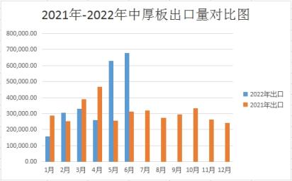 至于出口方面,據(jù)不完全統(tǒng)計,2022年6月份國內(nèi)中板出口量約為67.94萬噸,環(huán)比5月份出口量增加約8.1萬余噸,與2021年同期相比出口量增加約36.59萬噸左右,從圖中可見,中厚板品種出口量繼續(xù)增長,由于國內(nèi)市場不景氣,加之價格相較國外處于低谷,因此出口份額與往年同期相比有明顯增加。