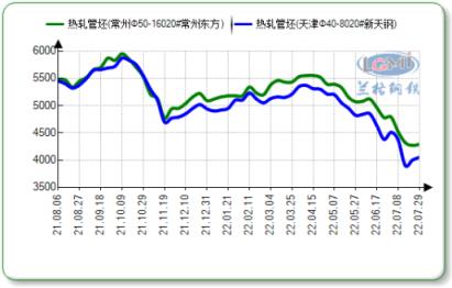 7月末,北方地區(qū)無縫鋼管廠家20#熱軋管坯出廠報(bào)價(jià)4050-4240元,20#連鑄出廠報(bào)價(jià)3940-4150元;南方地區(qū)20#熱軋出廠報(bào)價(jià)4240-4570元,北方新天鋼、南方東方兩家無縫鋼管廠家熱軋管坯價(jià)差維持在190元左右,較7月中旬相比兩者價(jià)差有所收窄。受美聯(lián)儲(chǔ)加息預(yù)期及國(guó)內(nèi)需求持續(xù)低迷影響,管坯價(jià)格大幅下跌,北方地區(qū)熱軋管坯價(jià)格跌至3970元,創(chuàng)近一年以來的新低,不過在7月27日筑底后管坯價(jià)格呈現(xiàn)小幅上揚(yáng)走勢(shì)。