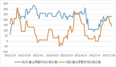 圖3 2022年杭州-唐山、沈陽-唐山焊管價(jià)差走勢(shì)圖
