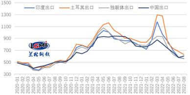 7月份,出口市場競爭激烈,主要出口國繼續(xù)下調(diào)厚壁鋼管出口報價。進入8月份,海外需求持續(xù)疲弱,各國厚壁鋼管出口報價仍有所下調(diào),而國內(nèi)市場出現(xiàn)反彈,出口報價有所上漲,云商平臺監(jiān)測數(shù)據(jù)顯示,2022年8月5日,印度、土耳其、獨聯(lián)體熱軋卷板出口報價(FOB)分別為565美元/噸、630美元/噸和560美元/噸,均較7月底有所下跌,中國熱軋卷板出口報價(FOB)為605美元/噸,較7月底有所上漲。