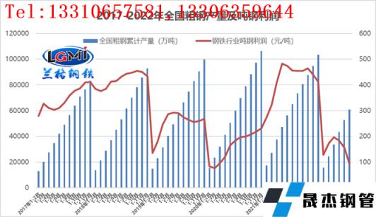 圖1 2017-2022年全國粗鋼產(chǎn)量及噸鋼利潤